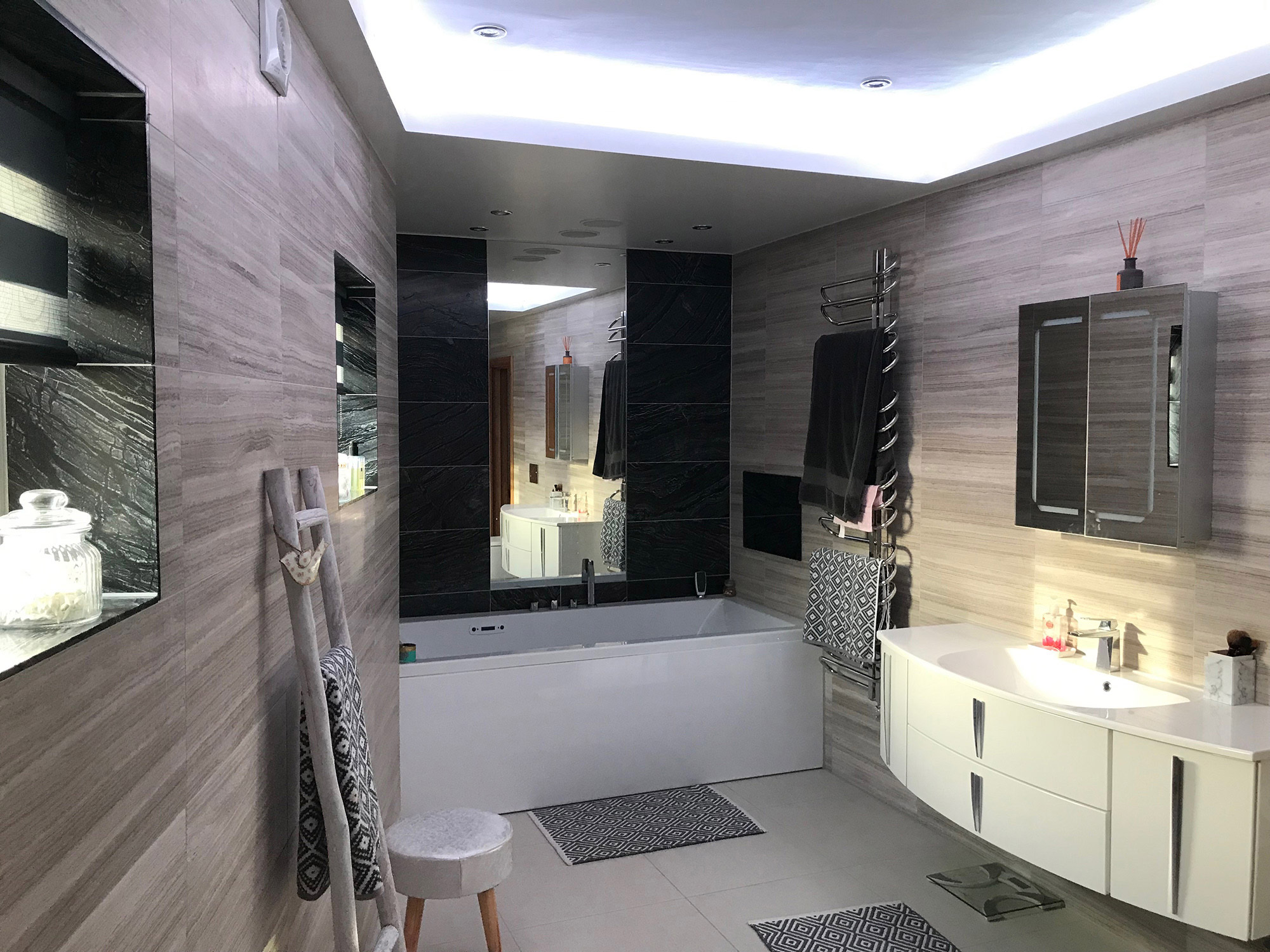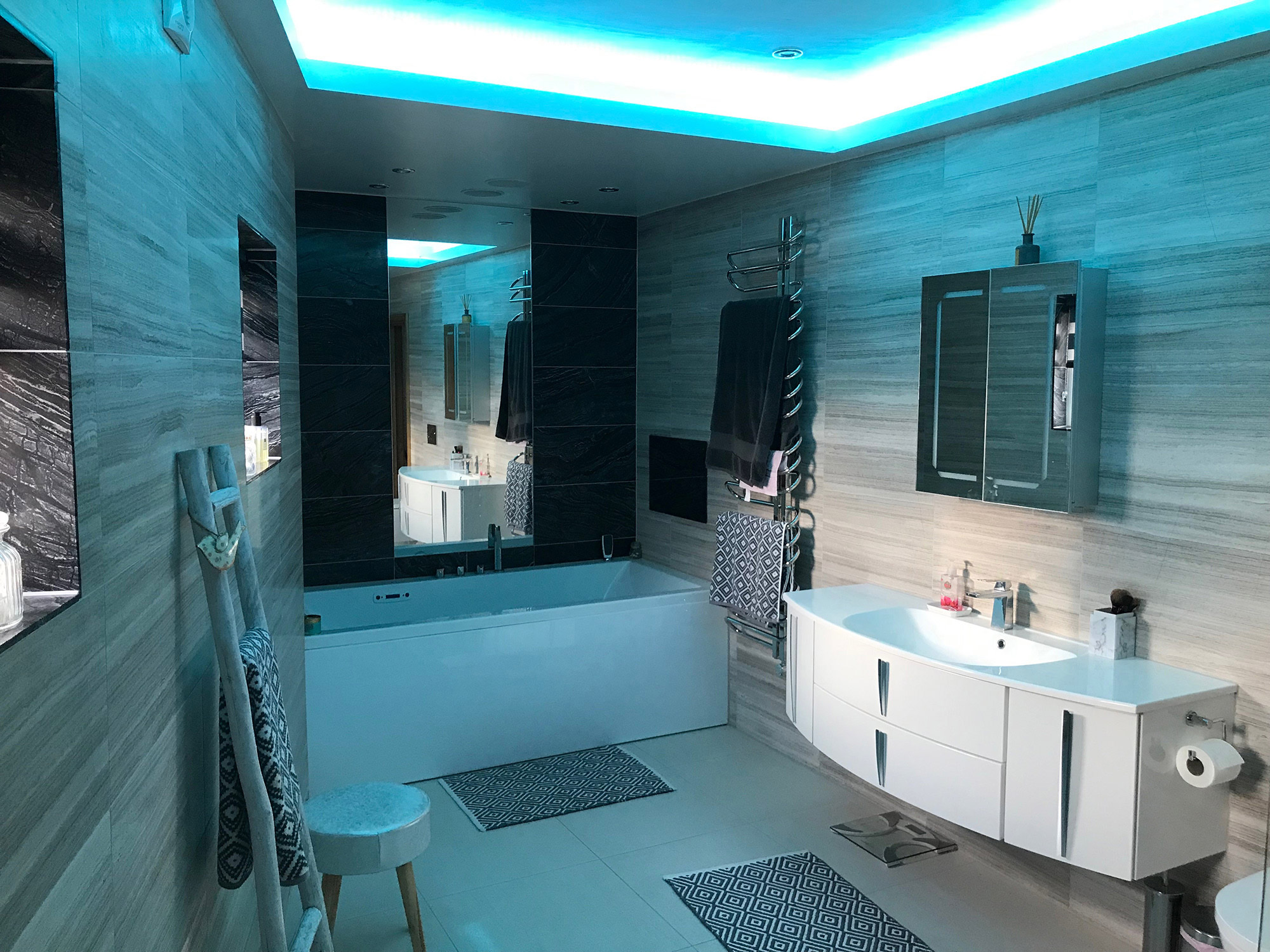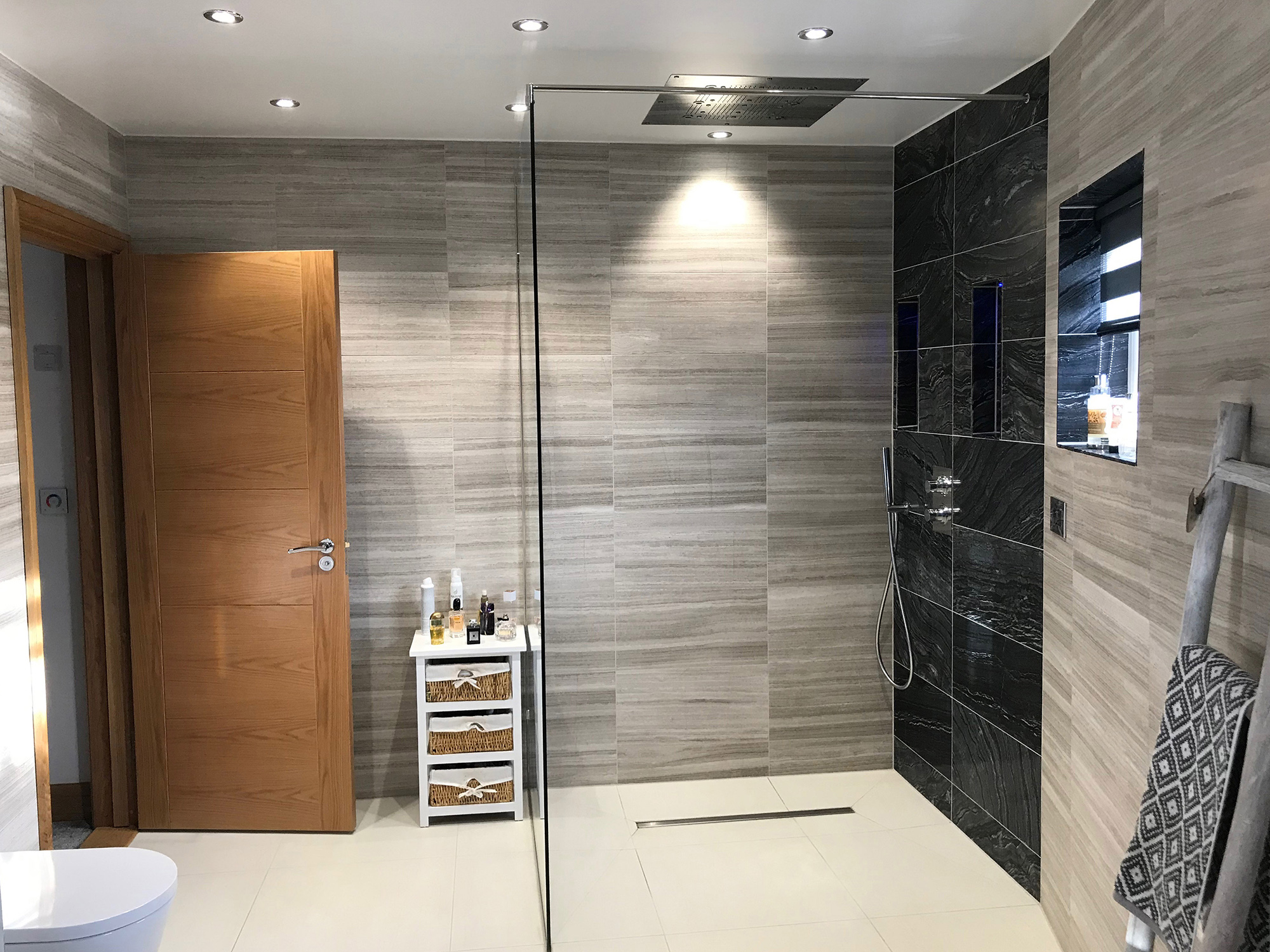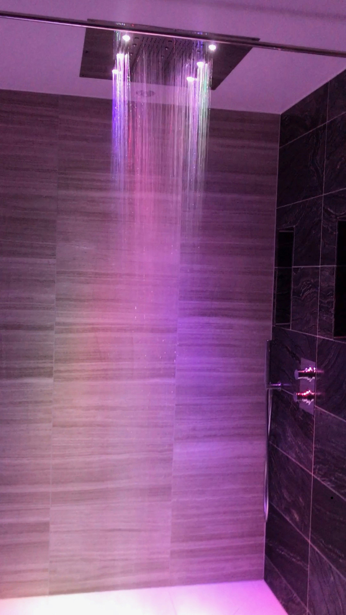 Bathroom/Shower Room featuring natural sand stone tiles & a T.V., at the end of the bath, mood lighting incorporated in the ceiling and shower head.